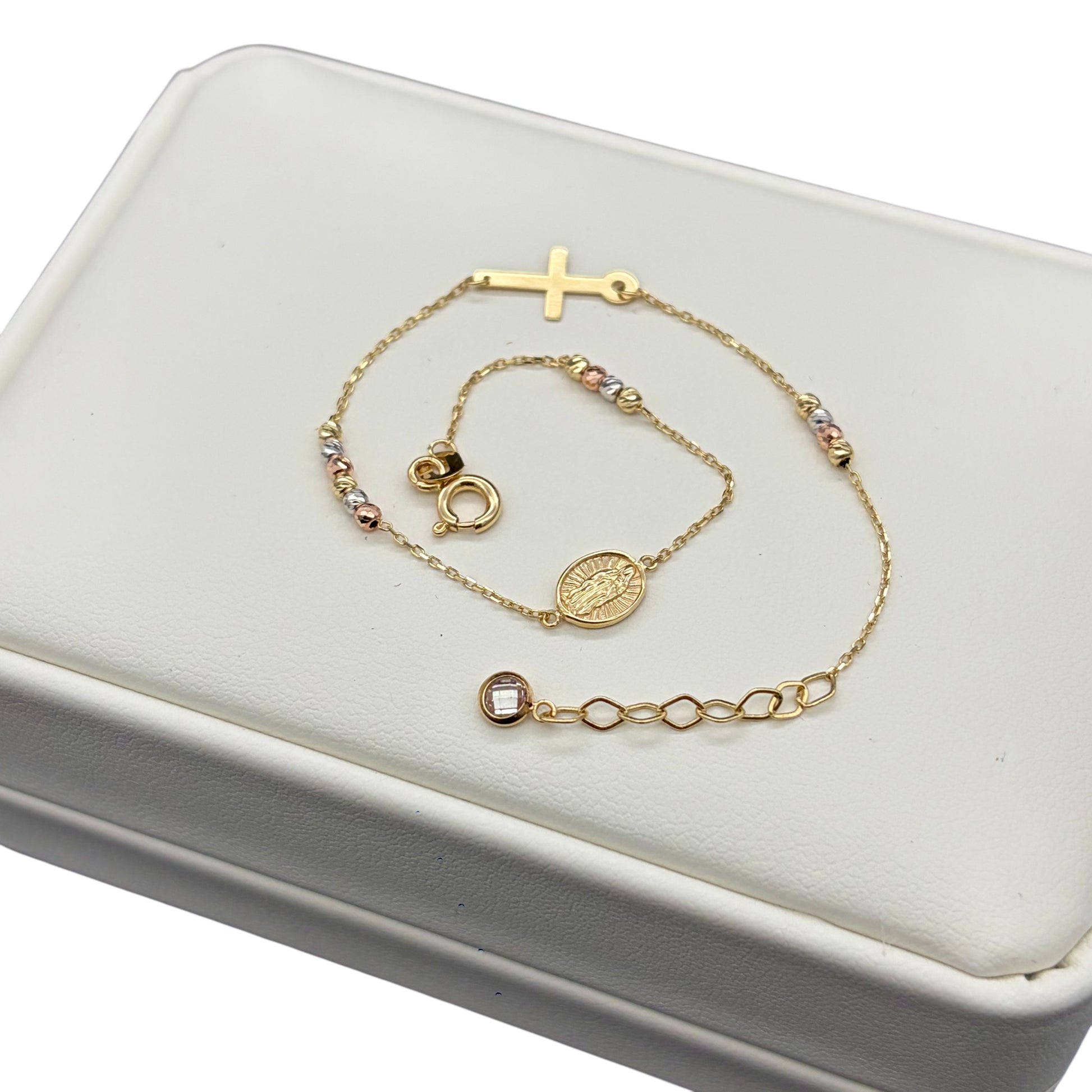 Pulsera delicada elaborada en oro auténtico de 14 kilates, diseñada para acompañarte con fe, estilo y protección. Su cadena fina incluye una cruz sencilla y un pequeño dije de la Virgen de Guadalupe, resaltados por bolitas diamantadas en colores amarillo, blanco y rosa que aportan brillo sutil a cada movimiento.