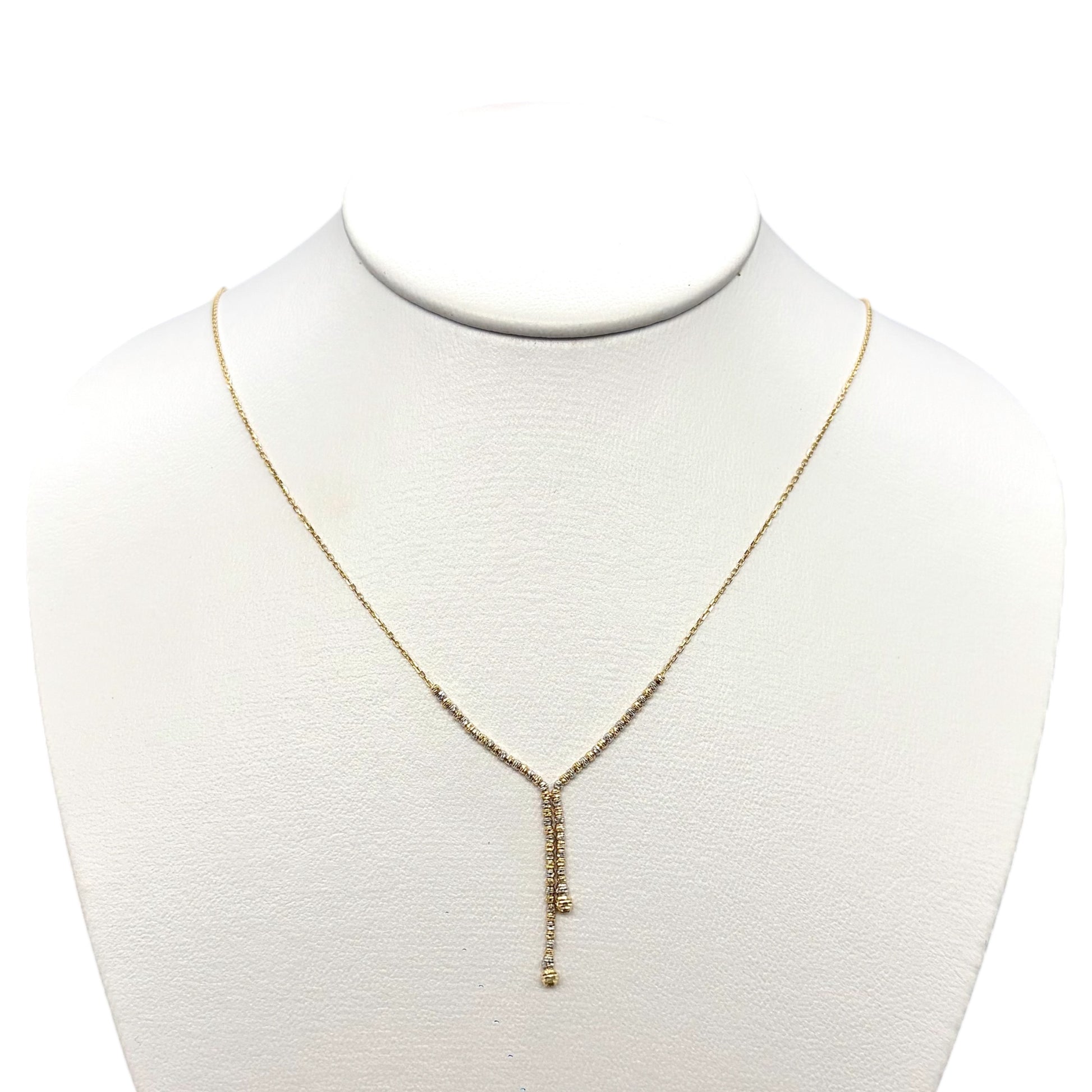 Gargantilla elaborada en oro auténtico de 14 kilates, con bolitas diamantadas que crean un efecto de caída elegante y delicado. Su diseño estiliza el cuello y aporta brillo sutil en cada movimiento, ideal para elevar cualquier look con sofisticación discreta.