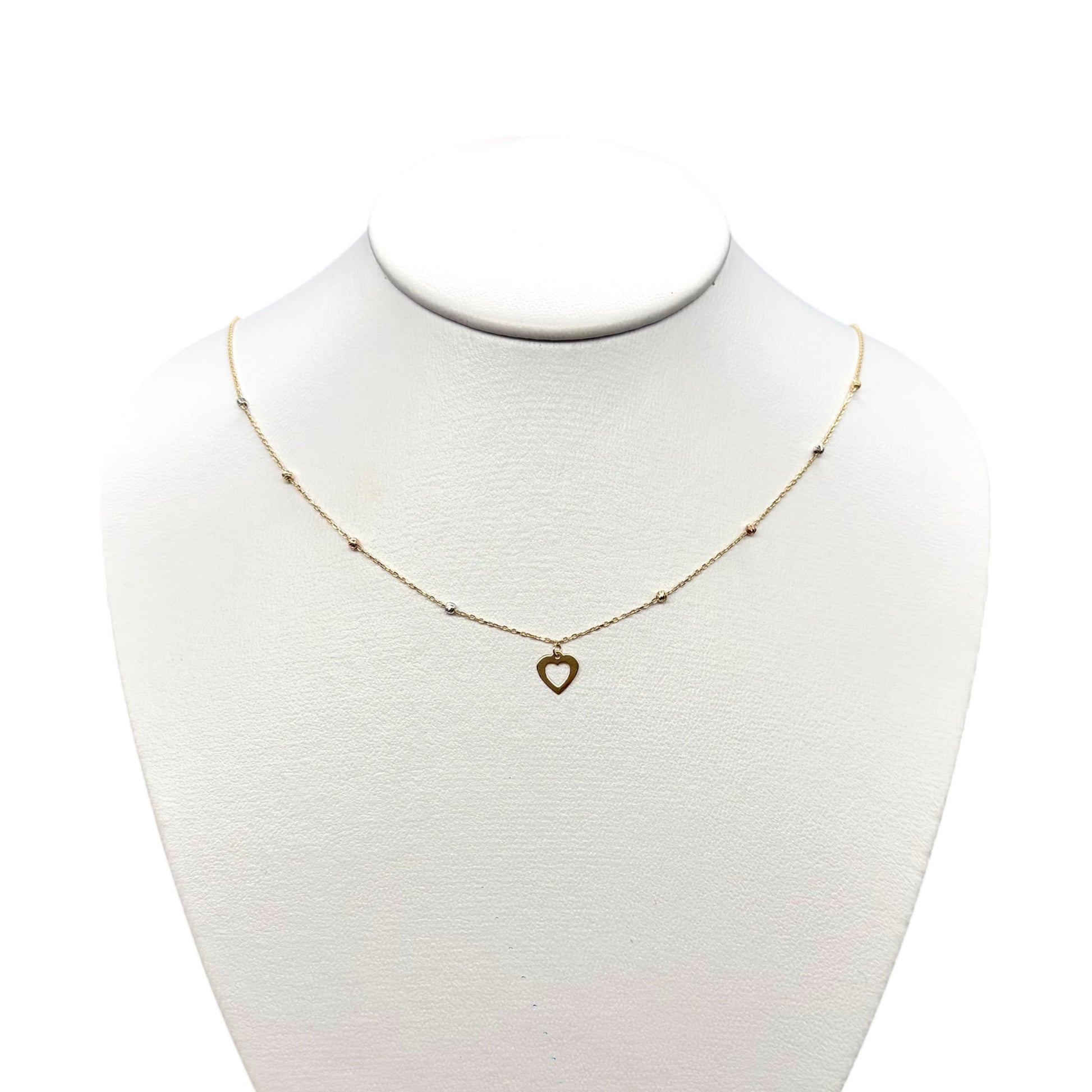 Gargantilla de diseño delicado con dije de corazón calado, acompañado de bolitas diamantadas distribuidas a lo largo de la cadena que aportan brillo sutil y textura al diseño. Su estilo fino y ligero lo convierte en una joya ideal para el uso diario o para regalar en un momento especial.